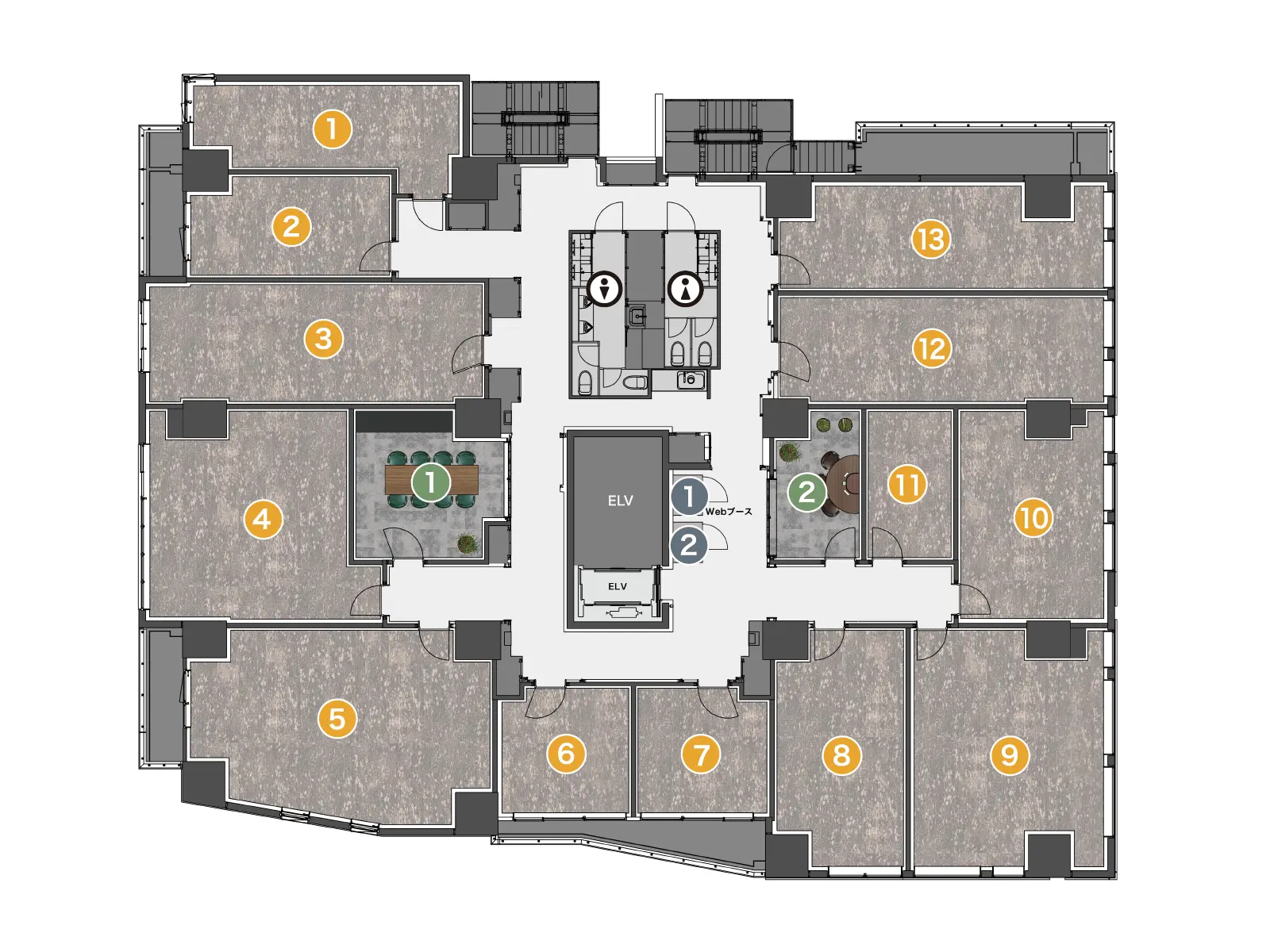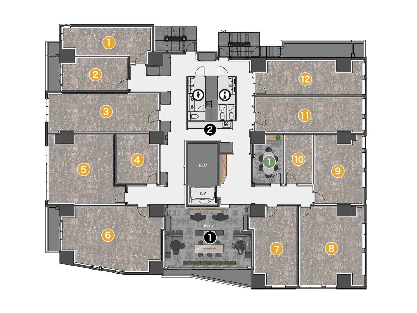 1~10名様以上などのご利用人数に合わせて広さを選べる完全個室プラン。共用部のラウンジや会議室なども利用可能。また、個室での法人登記が可能です。