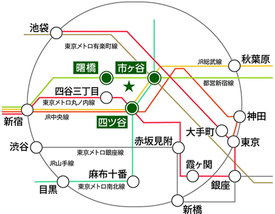 都営新宿線「曙橋」駅から徒歩5分 東京メトロ丸の内線・南北線「四ツ谷」駅から徒歩9分 JR総武線・中央線「四ツ谷」駅から徒歩10分 東京メトロ南北線・有楽町線・JR総武線「市ヶ⾕」駅から徒歩9分 |