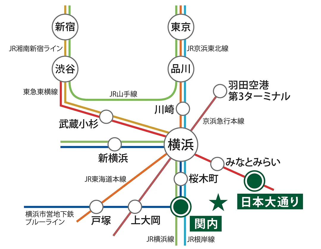 みなとみらい線「日本大通り」駅徒歩3分 ブルーライン「関内」駅徒歩6分 JR根岸線「関内」駅徒歩7分 |