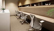 グリーンやアクアリウム、テラスに囲まれたリラックス空間。アロマの香り、心地よいBGM、やわらかな灯りが気持ちを整え、集中力を高めます。ドリンクコーナーの淹れたてコーヒーで気分転換。五感に寄り添う環境が仕事の質を向上させます。